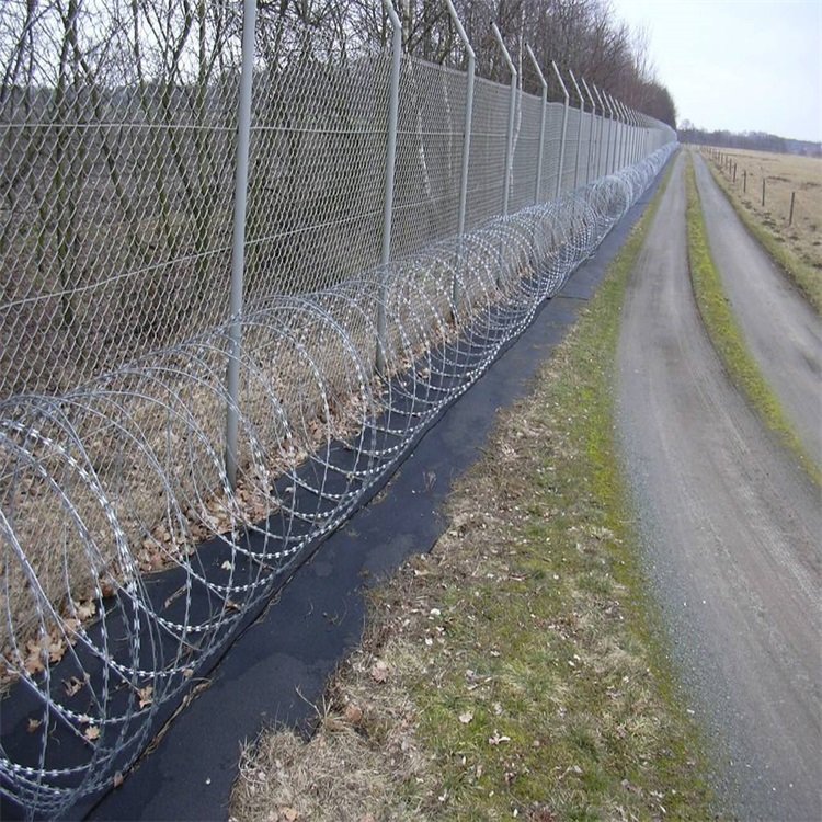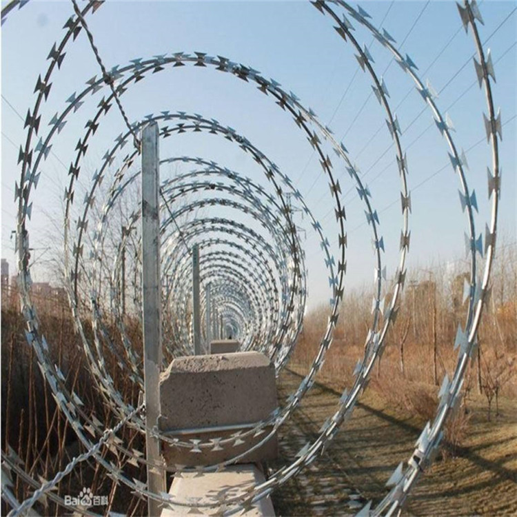 近年發(fā)展起來的防護(hù)、隔離能力較強(qiáng)的新型防護(hù)網(wǎng)產(chǎn)品。它采用鋼板沖壓成型包附于鋼絲之上,由銳利尖角鍍鋅鋼板或不銹鋼薄板做刀片,高張力鋼絲做芯線組合而成的。根據(jù)形狀可分為:螺旋式-刀片刺網(wǎng)、交叉式-刀刺網(wǎng)、平板式-刀片刺網(wǎng)、直線式-刀片刺網(wǎng)被廣泛應(yīng)用在監(jiān)獄,機(jī)場(chǎng),軍事基地等高安全場(chǎng)所。