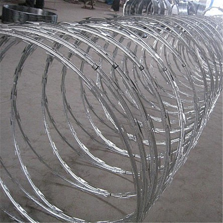 它是用不同材質(zhì)的鋼板與不同材質(zhì)的絲兩種原材料組合而成,先把所需材質(zhì)的鋼板沖壓出刀片的尖刀直條,在和所需材質(zhì)的絲包裹在一起,在制作出我們所需要的圈直徑即可,刀異常的鋒利,只要觸摸到就會被刺傷,不可能讓非法分子有攀爬翻越的機(jī)會,是現(xiàn)代社會各場所圍墻安裝的最佳防護(hù)隔離網(wǎng)。