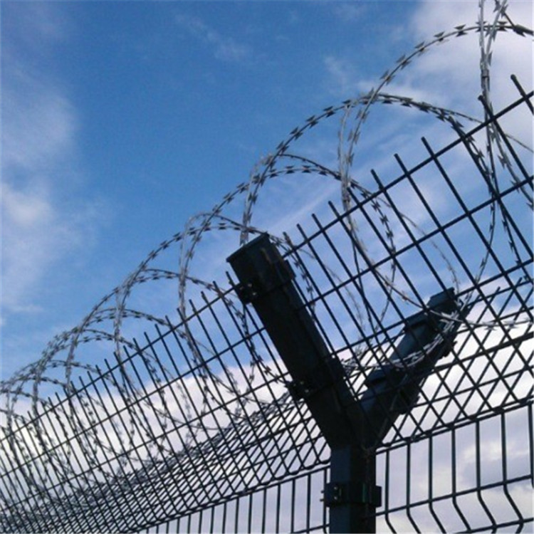 機(jī)場圍界又稱作“機(jī)場護(hù)欄”、“Y型安全防御護(hù)網(wǎng)”,它是由V型支架立拄,加強(qiáng)型焊接片網(wǎng),安全防盜連接件和熱鍍鋅刀片剌籠組成。安全防御性級別很高的隔離柵產(chǎn)品。近年來,被廣泛應(yīng)用在機(jī)場,軍事基地等高安全場所。
