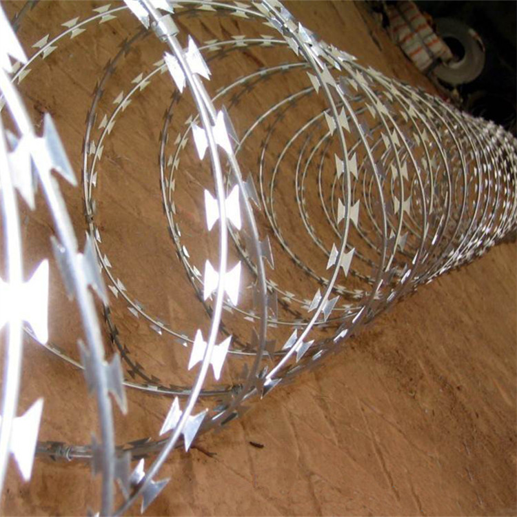 它采用鋼板沖壓成型包附于鋼絲(筋絲)之上,由銳利尖角鍍鋅鋼板或不銹鋼薄板做刀片,高張力鋼絲做芯線組合而成的。鋒利的刀型刺由雙線扣裝后成蛇腹狀,既美觀又讓人不寒而栗.起到了很好的阻嚇作用。