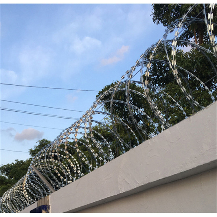 它是用不同材質(zhì)的鋼板與不同材質(zhì)的絲兩種原材料組合而成,先把所需材質(zhì)的鋼板沖壓出刀片的尖刀直條,在和所需材質(zhì)的絲包裹在一起,在制作出我們所需要的圈直徑即可,刀異常的鋒利,只要觸摸到就會被刺傷,不可能讓非法分子有攀爬翻越的機(jī)會,是現(xiàn)代社會各場所圍墻安裝的最佳防護(hù)隔離網(wǎng)。